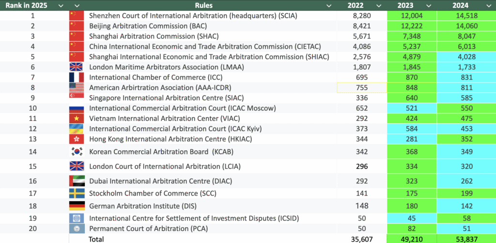- Outside of China, the Stockholm Chamber of Commerce (SCC), the International Centre for Settlement of Investment Disputes (ICSID), and the Vietnam International Arbitration Center (VIAC) have shown steady growth.